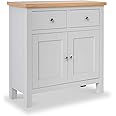 The RoselandFurniture Farro Mini Grey Sideboard is a fully assembled, compact storage cabinet crafted from solid wood with a premium oak veneer top. Measuring 75x75x32 cm, it features 2 drawers, 2 doors, and a full-width shelf, making it a versatile and stylish addition to any contemporary living room, kitchen, or hallway.