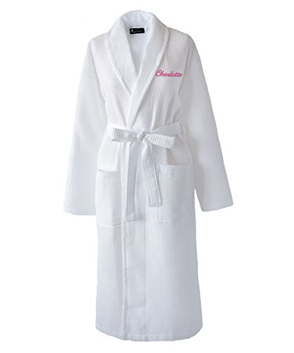 Bridal Party Wedding Day Waffle Bathrobes Any person or role can be included, from the Bride and Bridesmaids, to Aunty Peggy and your second cousins. Just let us know exactly what you want embroidered and for whom. *** Please write your embroidery details (name, font and embroidery colour) at the checkout in gift section or send an email to [email protected] *** PRODUCT SPECIFICATION The Bathrobe is 100% Cotton Waffle fabric, giving a soft luxurious Bridesmaids feel. The robe comes complete with a matching waist tie and 2 deep pockets. Available in five sizes; Extra Small, Small, Medium, Large and Extra Large. Smaller sizes (ideal for little Flower Girls) are listed separately. PERSONALISATION We will embroider exactly to your specification. Just let us know the following: The name or initials you would like embroidered on the front left chest and/or back (across shoulders) The font you would like (See options available in images above) The colour of the embroidery (All colours available) Please remember the way you write your specified text will be how it is embroidered, for example 'andrea' will be embroidered all in lower case,'Andrea' will be in upper and lower case and 'ANDREA' will be embroidered in upper case only. All dressing gowns do not have to match, you can have embroidery front and back of one but just the chest of another. DISPATCH TIME We embroider all of our garments in house using the latest embroidery technology and the highest quality thread. All orders may take up to 5 working days before the item is dispatched. Our standard delivery will be sent via standard second class post. Expedited delivery will be sent tracked with our courier. (Delivered next working day after dispatch)