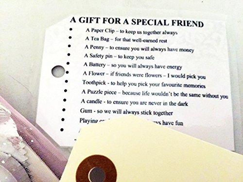 A lovely Christmas gift for a friend, a pretty organza bag contains at least 10 different items with special meanings that will delight any friend. Each bag has items that have been especially selected because of their meaning and to show how much your friend means to you. This pretty organza bag comes complete with a label listing the items to be found inside the bag and the meaning behind each of these items and a Christmas gift tag. Every item has been thought about and selected with a special Gran in mind. The items are designed not to be used but to be kept as a keepsake. This gift bag includes:- A GIFT FOR A SPECIAL FRIEND · A Paper Clip - to keep us together always · A Tea Bag - for that well-earned rest · A Penny - to ensure you will always have money · A Safety pin - to keep you safe · A Battery - so you will always have energy · A Flower - if friends were flowers - I would pick you · Toothpick - to help you pick your favourite memories · A Puzzle piece - because life wouldn't be the same without you · A candle - to ensure you are never in the dark · Gum - so we will always stick together · Playing card - to hope you always have fun · A plaster - for the blisters after shopping Thank you for being my Sister