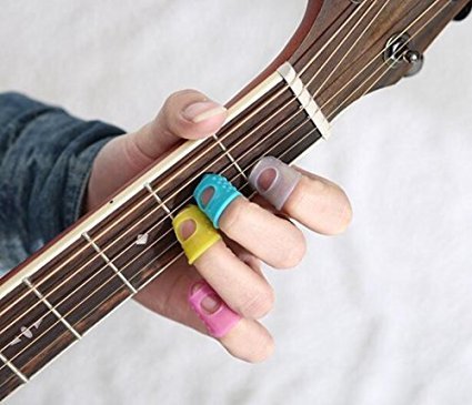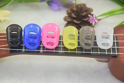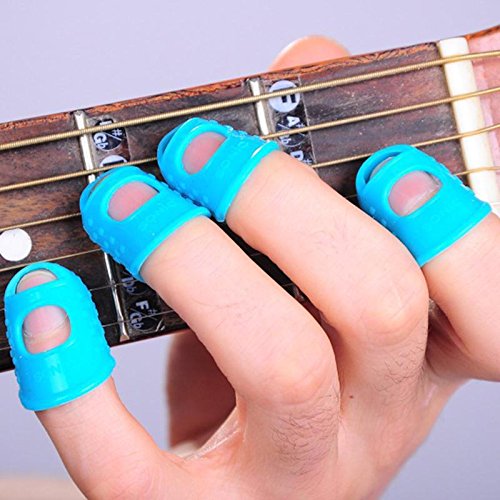 Silicone Finger Guards are the ultimate solution for sore fingers, experienced when learning to play a fretted instrument such as guitar, banjo, mandolin, or 'ukulele. Its design is engineered to have thicker material at the tip, which diminishes to a thin, stretchable perimeter for comfortable, flexible fit. A precision-molded transitional tool, each set comes with four washable, reusable, durable fingertip protectors that the player places over the tips of the fingers that touch the fretboard, allowing for hours of pain-free playing! This clear set of protectors allows for the most discreet comfort. The small size generally fits younger aspiring players and is measured by utilizing the sizing ring on the packaging or based on the width of your finger, closest knuckle to the fingernail.