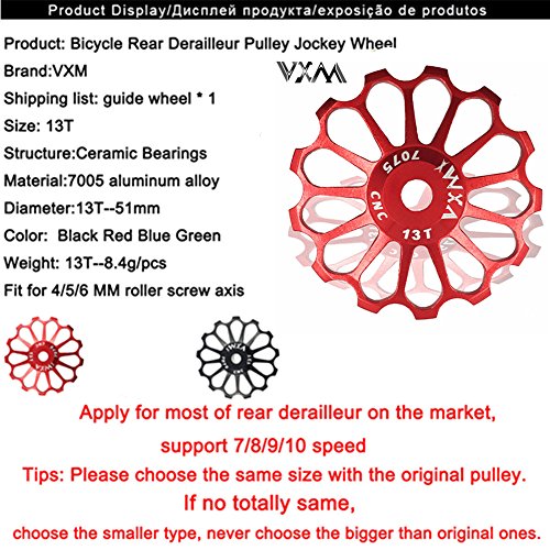 100% Brand New and High Quality Bicycle Ceramic Bearings Rear Derailleur Pulley. Suitable for: bicycle rear derailleur jockey wheel Gears: 27 Speed Tooth Size: 11 '12' 13 D 14 T 15 Depth: 16 D: 17 T Structure: Ceramic bearings Material: Aluminum alloy 7075 with ceramic bearings Diameter: 50 mm Setting for 4/5/6 mm spindle and shaft rollers Applies to most rear derailleur in the market, support 7/8/9/10 speed Transmission for a bicycle Stainless Steel bearing for ultra durability Color: Black, Red, Package includes: 1 x Bicycle pulley wheel (without retail package)