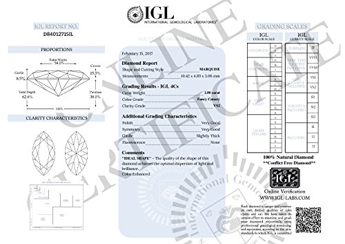 This loose diamond is a winner! She will love this Marquise shaped loose diamond. The carat weight of the diamond is 1. The color of the diamond is Canary Yellow(Irradiated), ) and the clarity is VS2. The measurements of the diamond are: 10.42X4.89X3.06. This stone is certified by IGL, cert #: D84012715IL. The cut of this diamond is graded as . This diamond has undergone the following clarity and color treatments: Irradiated, . All our diamond jewelry and loose diamonds arrive in a classic jewelry box and come with a 30-day return policy.