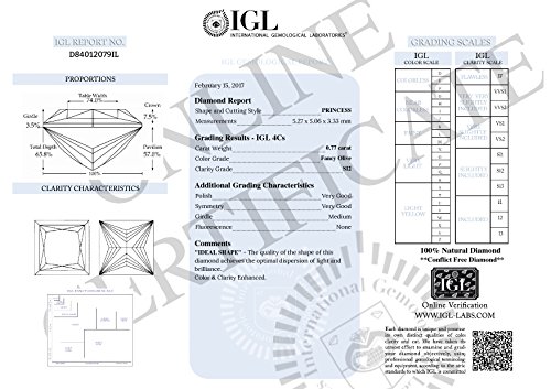 This loose diamond is a winner! She will love this Princess shaped loose diamond. The carat weight of the diamond is 0.77. The color of the diamond is Olive Green(Irradiated) and the clarity is SI2(Clarity Enhanced). The measurements of the diamond are: 5.27X5.06X3.33. This stone is certified by IGL, cert #: D84012079IL. The cut of this diamond is graded as . This diamond has undergone the following clarity and color treatments: Irradiated,Clarity Enhanced. All our diamond jewelry and loose diamonds arrive in a classic jewelry box and come with a 30-day return policy.