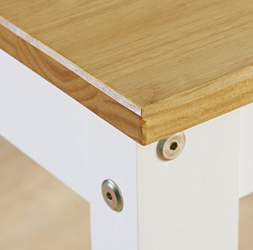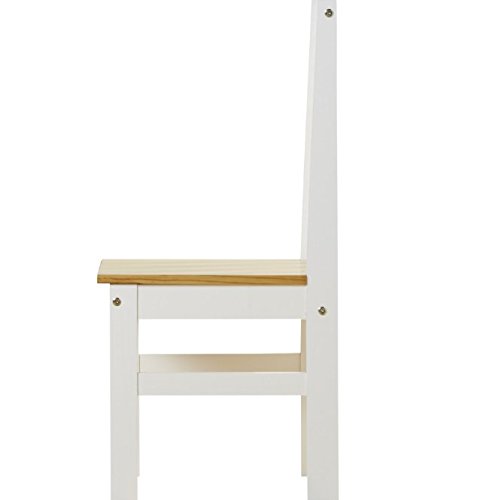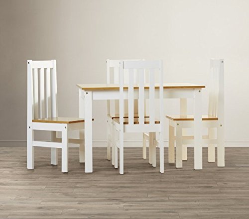Assembly Required Table Top Thickness: 2 mm Table: 75cm H x 80cm W x 110cm L Side Chair: 99cm H x 38.5cm W x 47.5cm D Height Frame: 64 cm Backrest height: 45 cm Features Table Top Material: Wood Top Material Details: Pine Table Base Material: Wood; MDF Chair Material: Manufactured wood Chair Material Details: Pine, MDF Pieces Included: 1 Table and 4 chair Top Finish: Natural Base Finish: White Chair Finish: White; Natural Distressed: No Number of Chairs: 4 Wood Construction Type: Solid and manufactured wood Wood Species: Pine Number of Items Included: 5 Formal or Casual Setting: Casual Leaf Included: No Shelving: No Drawers: No Seating Capacity: 4 Side Chair Included: Yes Armchair Included: No Chair Back Style: Slat back Bench Seating: No Chair Castors: No Table Base Type: Four leg Table Shape: Rectangular Breakfast Nook: No Storage Compartment: No