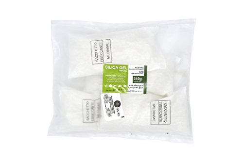 Silica gel desiccant non-woven fabric bags - 240 grams. DMF free product made in Italy. White Silica Gel desiccant material is in conformity with Technical standards DIN 55473, MIL 3464E, NFH00320.