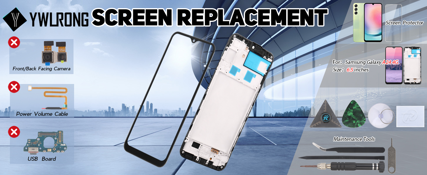 The YWLRONG Display for Samsung Galaxy A24 4G is a high-quality LCD touch screen digitizer assembly designed for various A24 models. It includes professional repair tools and has undergone strict quality control to ensure a perfect display without defects. Ideal for replacing cracked or malfunctioning screens, this assembly guarantees a seamless installation experience.