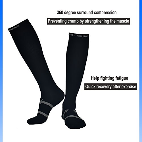 This compression socks make use of graduated compression technology to provide muscle support for both your shins and calves, It allows you to train harder, race faster, recover quicker & feel better! Perfect for running, endurance activities, workouts, competitions, racing and general sporting activities! Features: - 15-20mmhg True Graduated Compression - Lightweight Micro Nylon - Comfort Toe Seam - Moisture Control - Durable Heel & Toe Construction Result? These Knee-High Support Socks Can Help You: - Increase Blood Flow - Increase Oxygen to Muscles - Helps Prevent Injuries - Alleviate Shin Splints - Less Cramping - Aids in Recovery