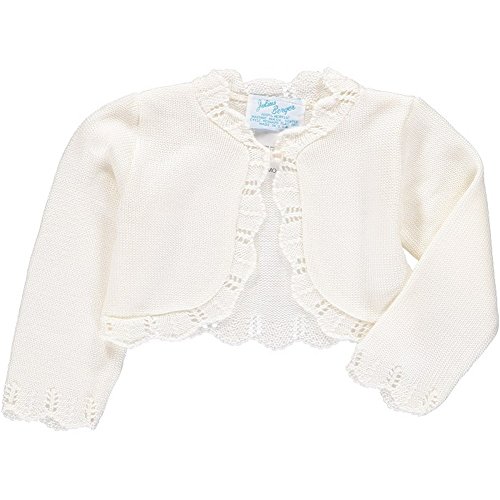 Ivory Classic Bolero from Julius Berger for your little one. This classic piece has a lot to offer with its style and craftsmanship. She is sure to catch anyone's eye, especially with its tremendously detailed stitching and scalloped edge. Mid torso. This listing consists of lovely acrylic fabric with designs throughout the hems and adorable beads. This is great for many occasions, suitable for little girls. Made in the U.S.A.