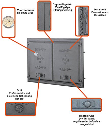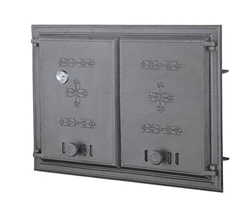 TECHNICAL DATA:Material: cast iron opening direction: double door Weight: 21 kg Thermometer: up to 500 degrees CelsiusExternal dimensions:Height: 480 mmWidth: 675 mm Installation dimensions:Height: 415 mmWidth: 610 mmDepth: 40 mm Light opening:Height: 400 mmWidth: 600 mm Delivery: - 1 x Cast iron double door - Mounting mustache or mounting pins Features: - Solid and longlasting - Ready for installation - Painted with heat-ressistant paint (black metallic) - Thermometer up to 500 degrees Celsius - Air flow control