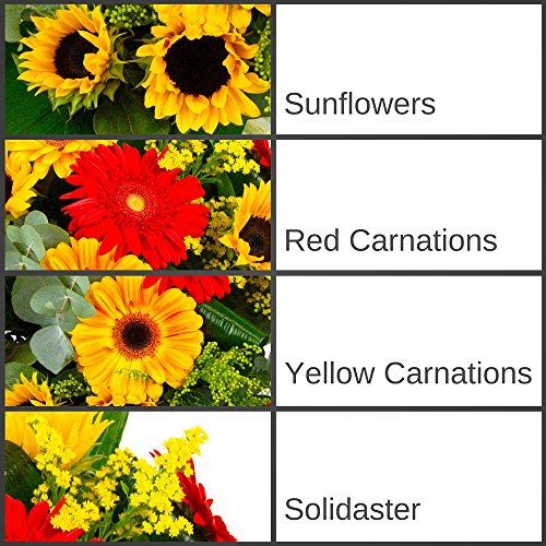 The Clare Florist Summer Sunshine bouquet affords you a touch of some of the cheer and warmth of the summer, no matter the season. Boasting germini, solidago, sunflowers arranged amidst eucalyptus and lush green leaves, this eye-catching bouquet is ideal for celebrations, birthday gifts, anniversaries or 'just because.' With free standard next day delivery, you can be assured of exceptionally good value for money with this bountiful bouquet of fresh flowers. Care Instructions re-cut the stems before you put them in the vase to make sure their vascular cells are wide open to take up water. Place the flowers immediately in clean water, mixed with the provided flower food, or they'll dry out and you've defeated the object of cutting. Make sure there are no leaves sitting below the water line, as not only will they rot and release harmful bacteria, which kills flowers, but they'll also consume vast amounts of the nutrients in the flower food which need to get up the stem to the flower head. To maintain the look of your flowers, repeat the process three or four days later, removing any wilting or dead flower heads so that the water supply is sent to the flowers still blooming or, in the case of multi-headed varieties, still to open.