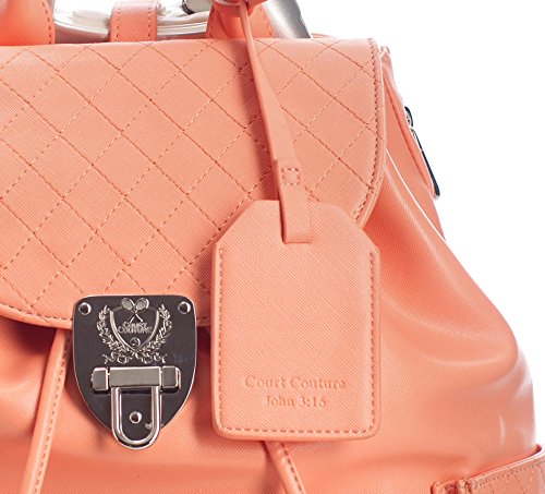 Uniquely designed compartment on the back to fit two (2) most commonly sized tennis racquets. Snap button on each side to keep the zipper from opening. Front and side pockets are secured with a hidden magnetic button. Main compartment has a zip and two open pockets. Padded and fully lined with polka dots cotton fabric. Metal feet to protect the bottom. ID holder tag. A multi-purpose hook for hanging the bag on the court fence. Saffiano cross grain faux leather. Pull string to secure the main compartment. Decorated metal lock with logo. Measure: 15" H x 14" W x 8" D. Weight: 3lb. 1oz. Colors available in Obsidian, Coral, Aquamarine and Strawberry-ice.