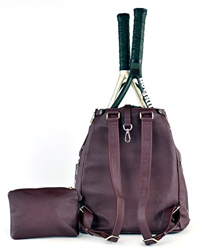 Uniquely designed compartment on the back to fit two (2) most commonly sized tennis racquets. Matching wristlet included. Snap button on each side to keep the zipper from opening. Front and side pockets are secured with a hidden magnetic button. Main compartment has a zip and two open pockets. Padded and fully lined with polka dots cotton fabric. Metal feet to protect the bottom. A multi-purpose hook for hanging the bag on the court fence. Court Couture exclusive tennis racquet print on Saffiano cross grain faux leather. Pull string to secure the main compartment. Decorated metal lock with logo. Measure: 15" H x 14" W x 8" D. Weight: 2lb. 14oz. Colors available in Onyx, Midnight Blue, Merlot and Cafe au lait.