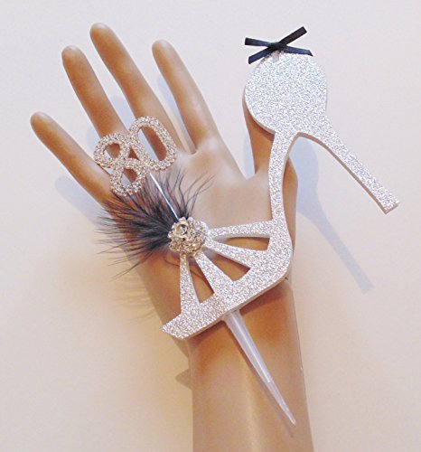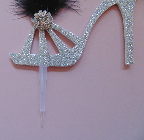 A beautiful cake topper to transform any cake into a party piece. A foam and cardboard cut out high heeled shoe with embellishments and a diamante number. This cake topper comes ready assembled in a plastic cake pick which allows the topper to be safely inserted into your cake. Spike is approx 5cm in length and 7mm at it widest. This cake topper is non edible and contains small parts and should therefore not be used as a toy and kept away from young children.