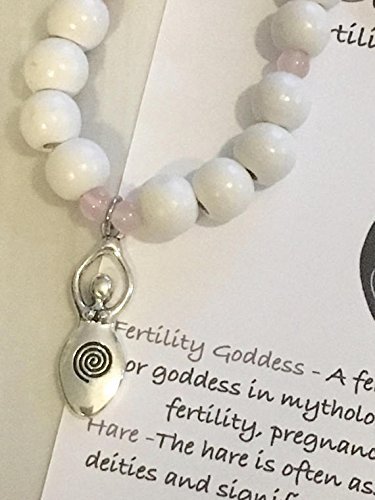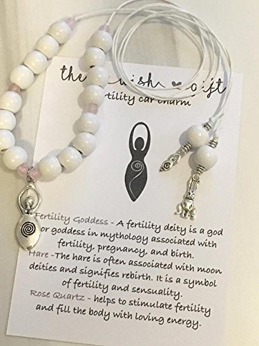 A fertility goddess car charm made with white wood beads and fertlity charms with added rose quartz beads...can be used as a window or bag charm also. Will arrive with the gift card shown which has the meanings of charms and stone.