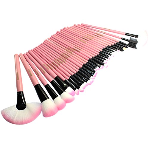 Brushes set includes: Big Sector Brush Full Coverage Face Brush Bronzer Brush Face Blender Brush Angle Face Shadow Brush Blush Brush Foundation Brush Eye Shadow Brush Angle Eye Shadow Brush Small Plane Brush Big Plane Brush Concealer Brush Wedge Brush Touch Up Brush Cream Shadow Brush Concealer Blending Brush Lip Brush Eye Definer Brush Eyebrow Brush Sector Brush Sponge Eye Smudge Brush Eye Liner Brush Ultra Fine Eyeliner Brush Eyelash Brush Eyebrow Comb Specifications: Material: Wood + aluminum alloy + nylon hair + PU leather Quantity: 32pcs Color: Pink/Black Bag rolled-up size: 14 * 24cm/ 5.5 * 9.5in(W * L) Bag unfolding size: 70 * 24cm/ 27.6 * 9.5in (L * W) Size of brushes: Around 17~20cm/ 6.7~7.9in Total weight: Around 457g/ 16.1oz Package includes: 1 * Set of 32 brushes 1 * leather case