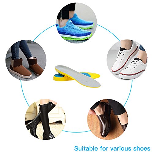 Choose Lysport PU Sports Insole. Stay Active without Foot Pain! GEL Pad in the Forefoot - Absorb the impact from ground and reduce pressure of feet with high elasticity. PU Layer Material - Super flexible support to distribute stress on the feet. Arch Support - Maximize support and protection to the arch. GEL Pad in the Heel - Shock absorption to enhance stability and cushioning. U-shaped Heel Design - Reinforce heel stability to avoid foot valgus. Massaging Particle Design -Helps alleviate pain of foot. Skin-friendly Velvet Surface - Sweat absorption and help remove foot odor effectively. Breathable Holes Design -Anti-bacterial to keep your feet dry and comfortable. Versatile - PU insoles can be used for sports shoes, casual shoes, leather shoes, cotton shoes or boots. Specifications: Material: PU + GEL + Velvet Color: Blue + Yellow + Grey Size: Large size/US's Men 8-10; Medium size/US's Women 7.5-10; Small size/US's Women 5-6.5 Weight: Large 4.2oz / Medium 3.8oz / Small 2.9oz Instructions: 1.Remove the original insoles from the shoe. 2.Compare the new insoles with original ones. 3.Use the original insole as a guide, trim along the outline on the bottom of the new insoles to fit with your shoes. 4.Insert new insoles in your shoes. 5.It is recommended the insoles should be replaced every 3 months. 6.Put the insoles in a ventilating place to keep them dry and fresh.
