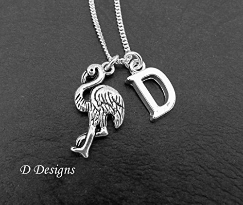 Silver Flamingo pendent on a silver chain. ~Choose your chain from either high quality silver plated or 925 sterling silver ~ Length of chain 18" ~The necklace fastens with a clasp. ~ charms are silver zinc alloy plated length of charm 2.5cm in length. Extra Initials available. Also available to add is a birthstone. The birthstone is Preciosa 6mm Czech crystal bicone bead AB wrapped with sterling silver wire ****GIFT WRAPPING**** Comes wrapped in black tissue paper inside a grey organza bag ready to gift.