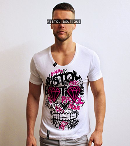 MENS WHITE LIGHT WEIGHT SCOOP NECK "GRAFFITI CANDY SKULL" T-SHIRT BY PISTOL BOUTIQUE