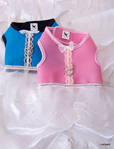 PLEASE NOTE THESE ARE SMALL HARNESSES MEANT FOR SMALL DOGS ONLY. Gorgeous Dog harness dress that will really make your doggie stand out from the crowd. Mesh harness top with strong velcro fastening, with a lovely frilly skirt and faux pearls sewn on. A real crowd stopper! I offer exchanges on this item for simply £1, so if it doesnt fit simply return with £1 included and i will swap for the other size. SMALL- fits chest 34cm, back length 21cm MEDIUM- fits chest 37cm, back length 24cm LARGE- fits chest 42cm, back length 26cm XL: fits chest 47cm, back length 30cm