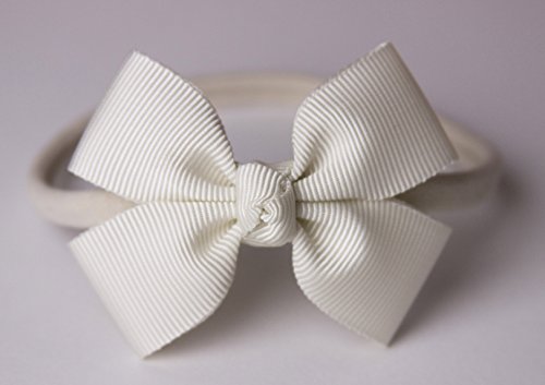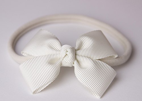 A sweet ivory grosgrain ribbon bow, on a skinny ivory nylon headband. The headband is very comfy and soft. It is small enough to fit a newborn baby and stretches to comfortably fit an adult. (Please check product measurements) The bow is approximately 6.5cm long by 5.5cm wide. The headband measures approximately 28cm relaxed or 68cm when stretched. A perfect photography prop.