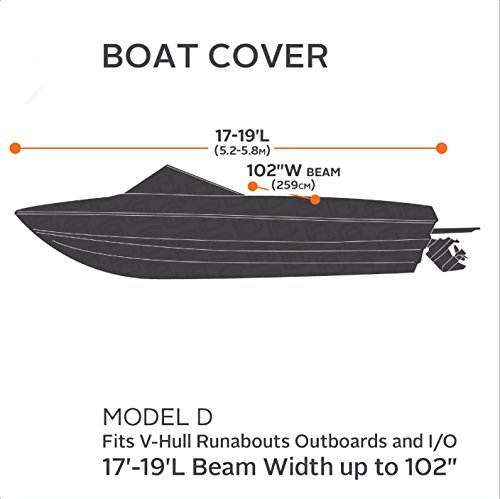 Features - Fits Bayliner and other major speedboat brands within the sizes specified. - Integrated buckle and strap system for easy fitting and trailering, adjustable straps snap into quick-release buckles on the cover . - Full cut to allow extra room for accessories such as bow rails, running lights, etc. - Elastic cord sewn into bottom hem gives a tight, custom fit. - Dual rear air vents with built-in stiffeners reduce wind pressure during trailering and storms and allow inside moisture to escape. - High strength polyester fabric designed for extra durability and all-weather protection. - Fabric coating technology and heavy-duty fabric for maximum water-resistance and repellency. - Resistant to mildew and UV damage. - Storage bag and trailering straps included. Size Chart: 11'-13'L Fit V-hull fishing boats with beam width up to 75". 14'-16'L Fit V-hull fishing boats with beam width up to 90". 17'-19'L Fit V-hull fishing boats with beam width up to 102". 20'-22'L Fit V-hull fishing boats with beam width up to 106". Package inside: 1 x Boat Cover numbers of Tie-down straps ( Quantity of straps determined by boat size) 1 x Storage Bag