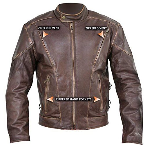 This racer jacket is anatomically fitted for riding position. It is made of premium top grain distressed cowhide leather for maximum abrasion resistance. In addition to protection, distressed leather gives unique look and feel to each jacket. On the back of the jacket is an enlarged flying skull with the word "mayhem" above. The jacket also features heavy-duty zippers, zippered chest and rear exit vents, 2 exterior zippered hand pockets, 2 interior snap pockets, a removable insulating inner zip-out quilted vest liner, zippered cuffs, lower back padding, and lace tie-ups on sides for adjustable fit.