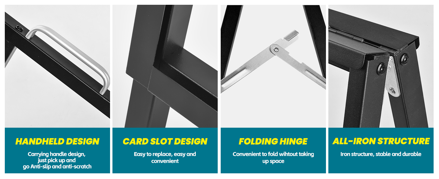 This 24x36 inch A Frame Sidewalk Sign features a heavy-duty all-metal frame with a weatherproof finish, designed for both indoor and outdoor use. It includes two corrugated boards and anti-glare covers, allowing double-sided advertising with easy slide-in poster replacement. Lightweight yet sturdy, itβs perfect for businesses seeking durable, high-visibility signage that stands up to daily wear and weather.