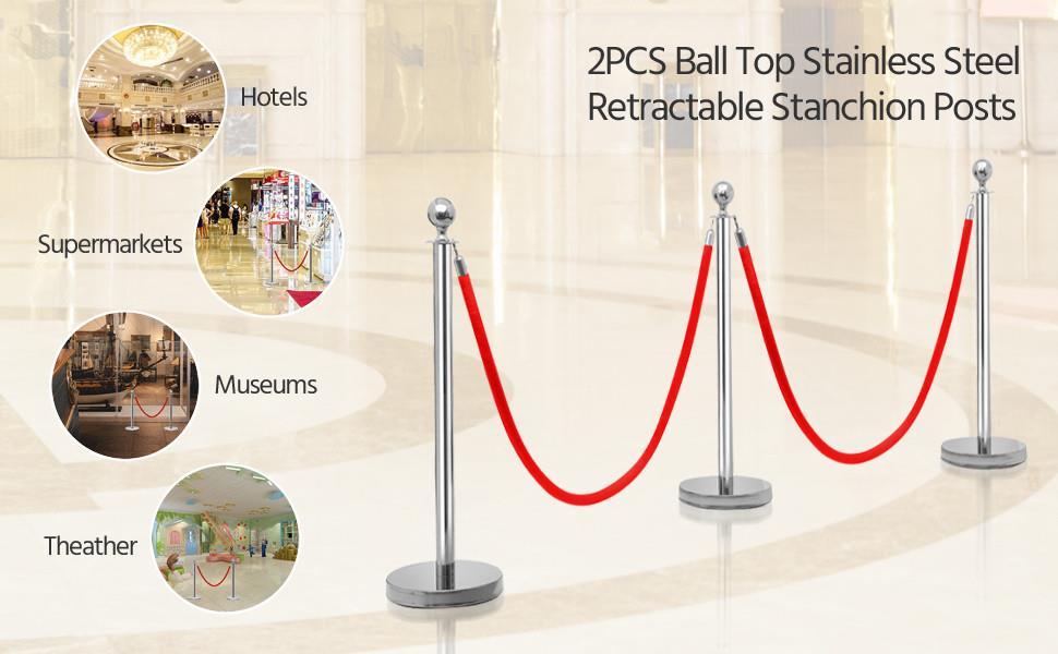 The Yaheetech 4pcs Stainless Steel Stanchion Set features 6.6 ft burgundy velvet ropes paired with 39.5-inch tall 201 stainless steel posts. Each post anchors to a 15 lb cement-filled base for superior wind resistance and stability. Tool-free assembly and premium materials make this set ideal for professional crowd control in hotels, theaters, clubs, and special events.