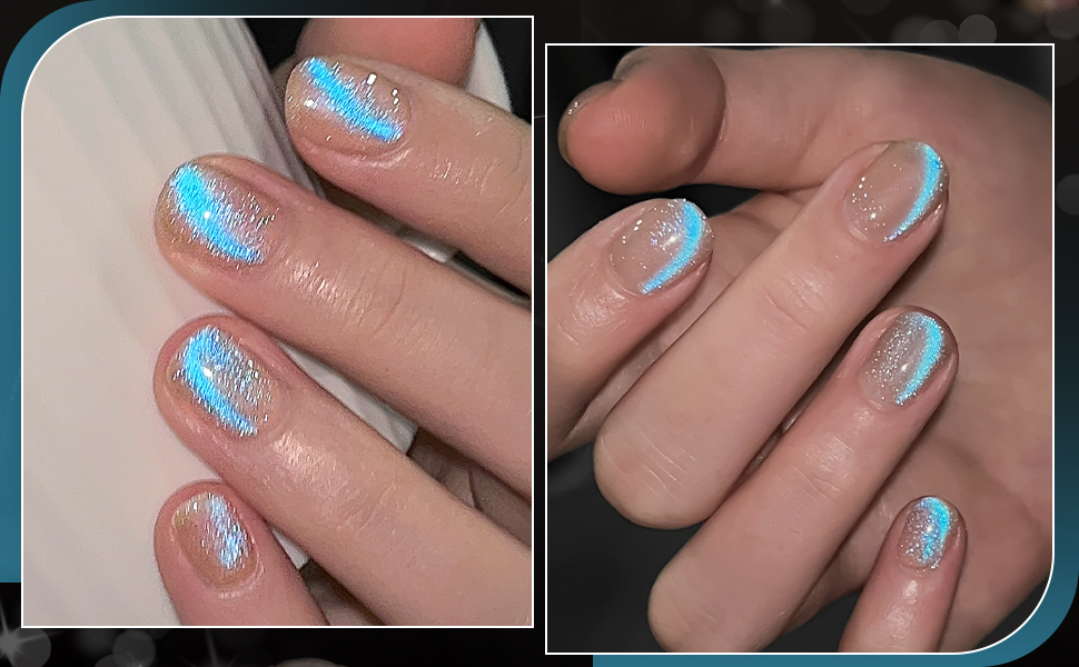 GAOY Cat Eye Gel Nail Polish offers a 16ml bottle of holographic blue glitter polish with a nude base, enhanced by a magnetic tool to create unique cat eye effects. It cures quickly under UV light in 60 seconds, is low odor, toxin-free, and certified safe, making it perfect for professional-quality manicures at home.