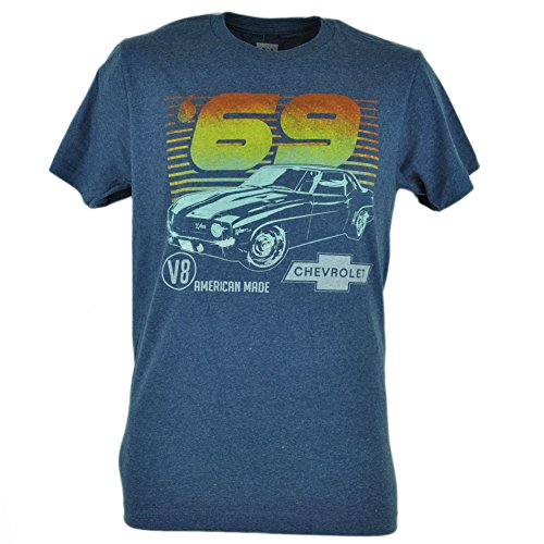 Show your love with old school aplomb in this blue t-shirt from Chevrolet featuring a vintage Camaro graphic print complete with the classic 1969 Z28 posing on the front.This is definitely a must have for anyone whose passion goes beyond the road. Adult size. Authentic Merchandise. Officially Licensed Product.